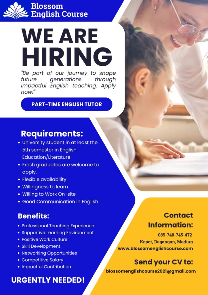 • Kirimkan CV dan surat lamaran ke email kami: blossomenglishcourse2021@gmail.com